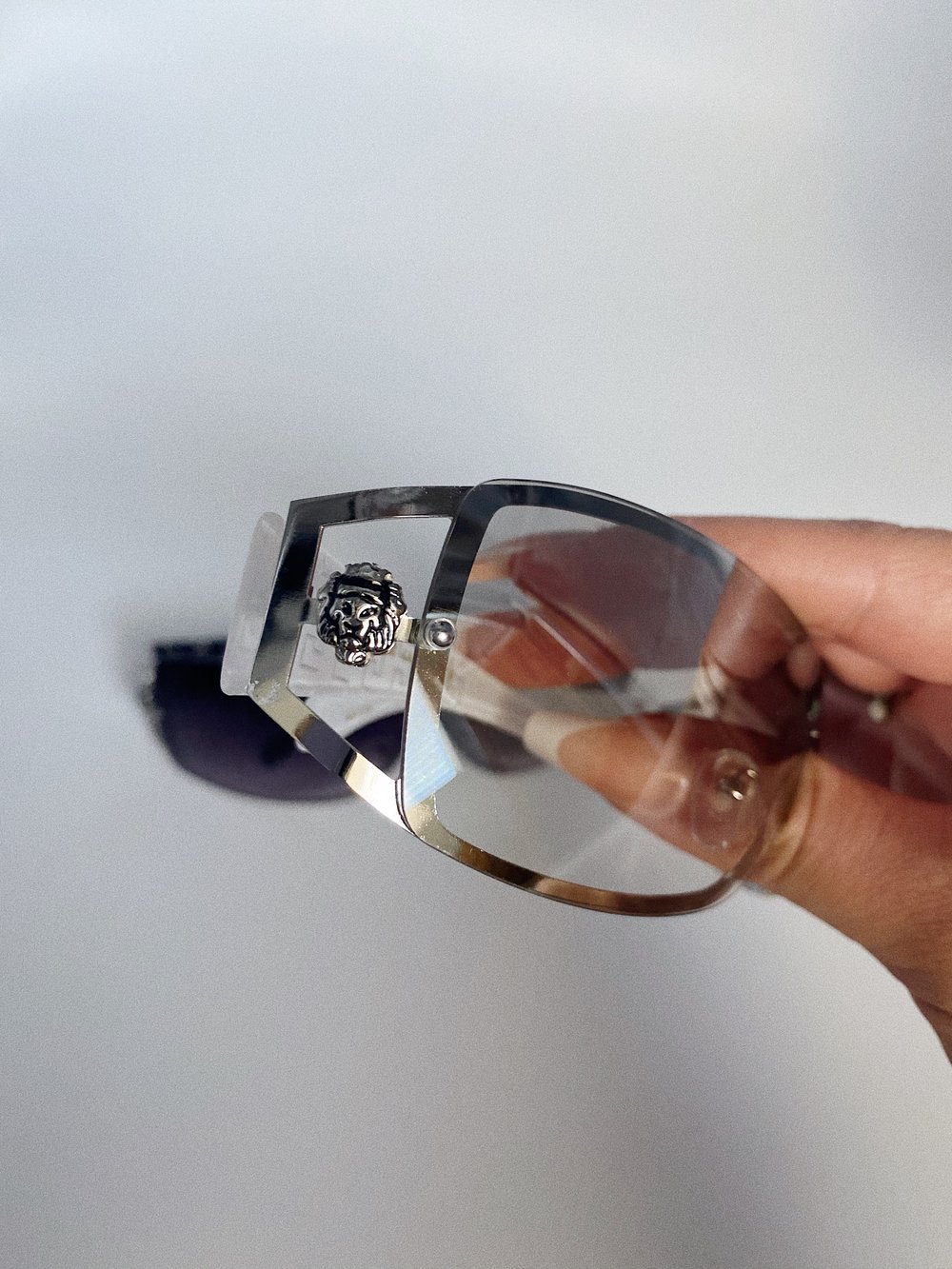 SILVER or GOLD metal frame and black, brown or clear lens with a unique lion accent. These frames feature a unique rectangle design that boasts a shield-style curvature that is designed to minimize sun glare and rock today's upscale fashions. UV400